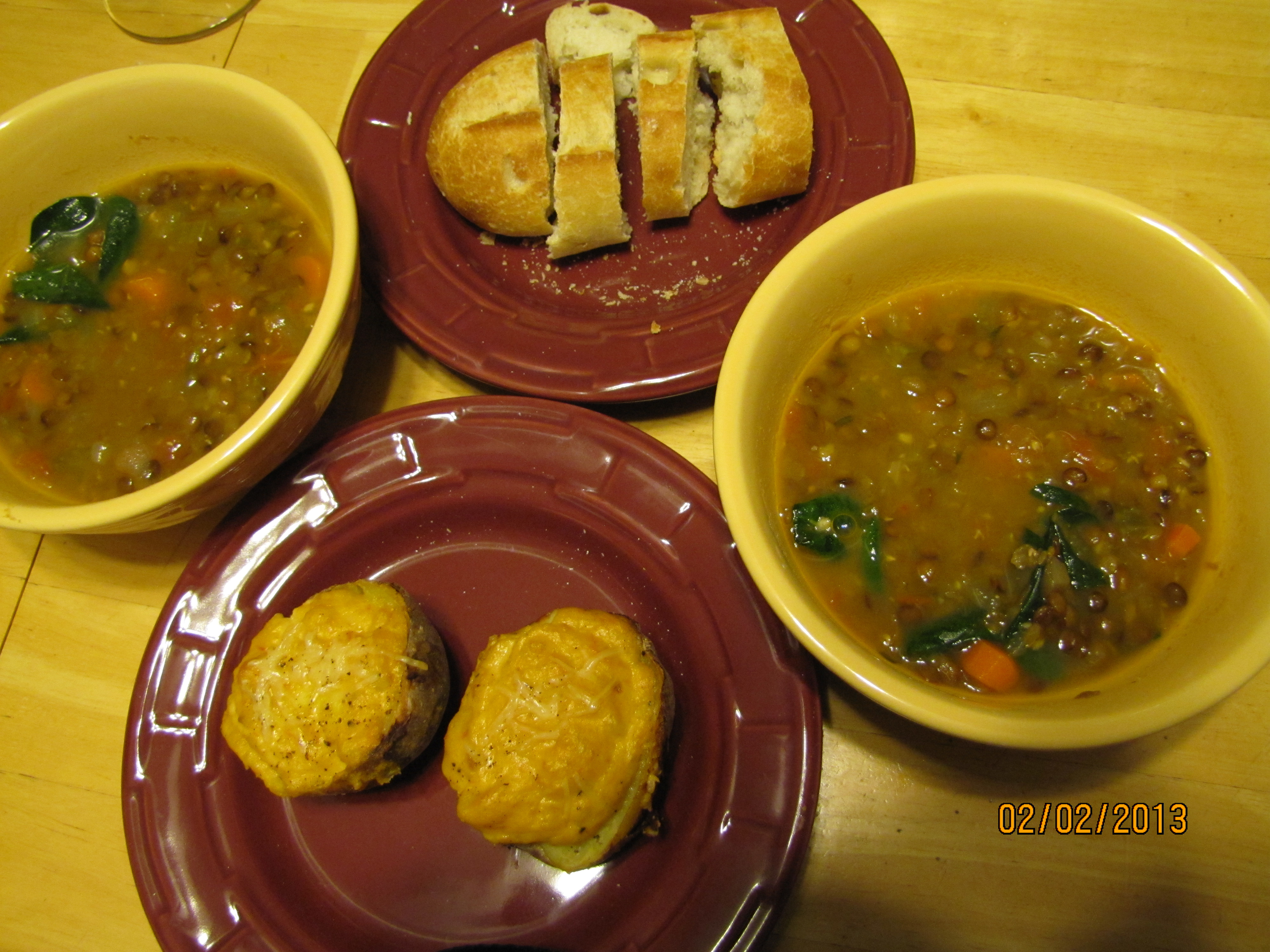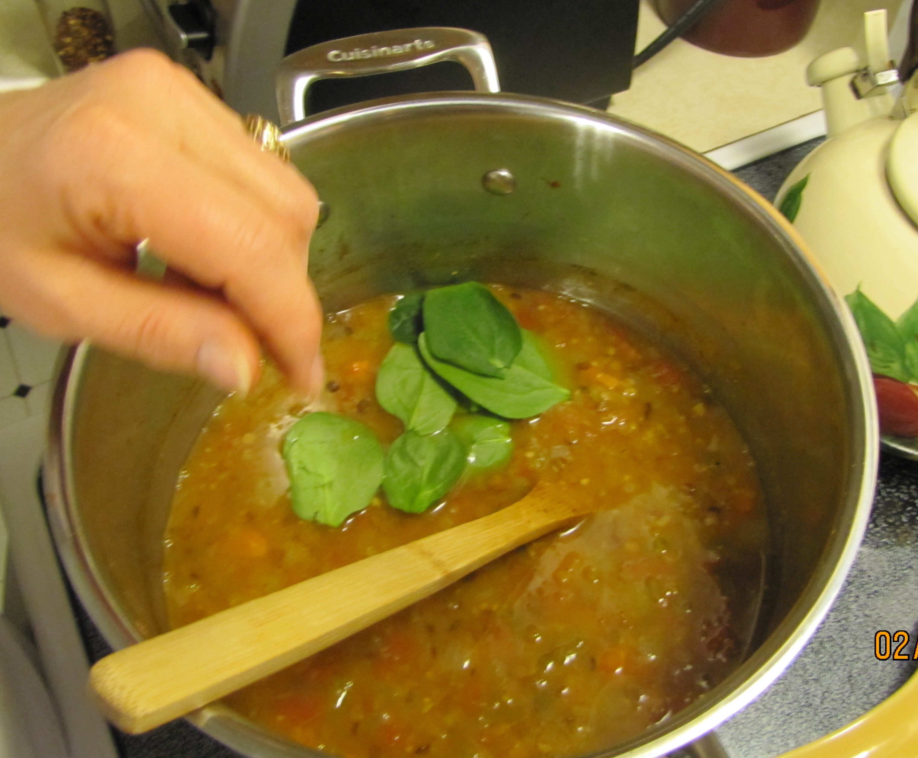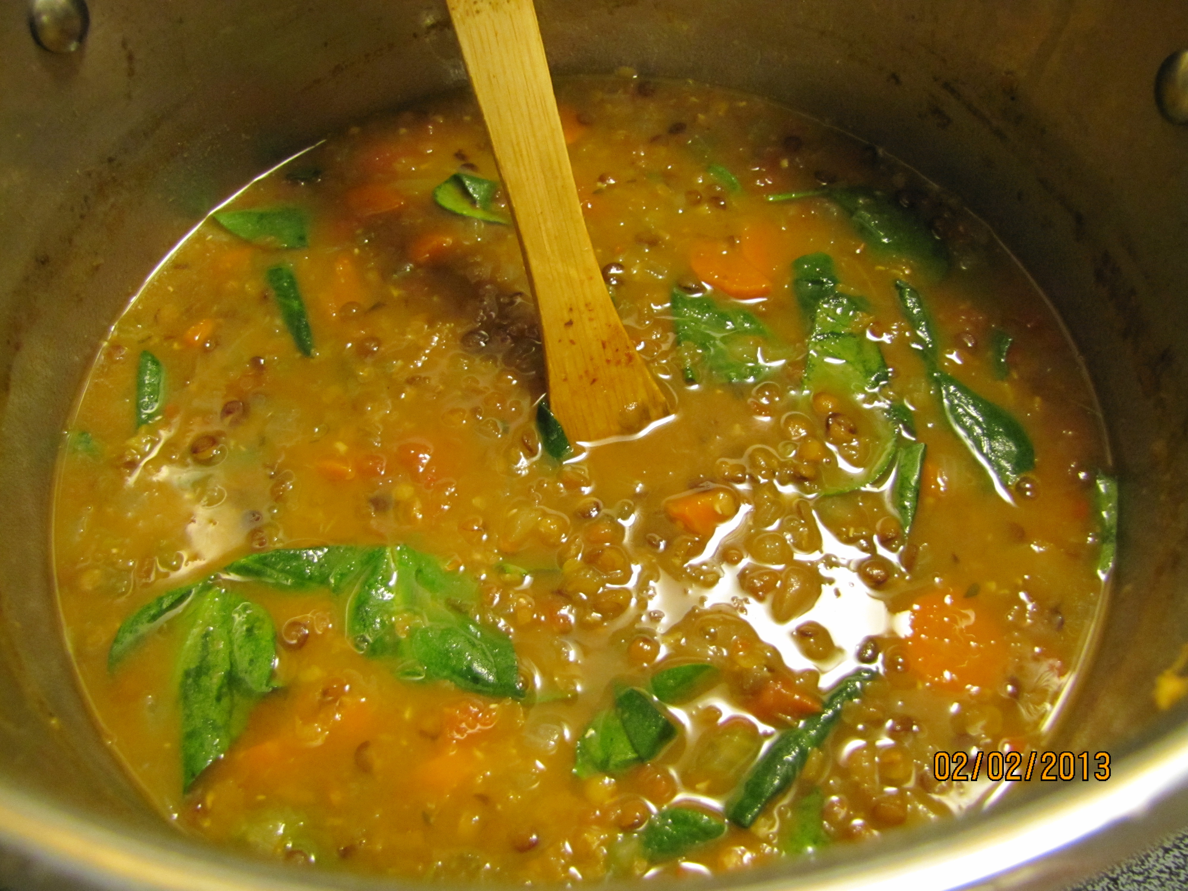 Bring the soup to a boil and reduce heat to simmer. Place a lid on the pot and cook (stiring occasionally) until veggies are tender and lentils cooked. Approximately 20 minutes to 1 hour. Add spinach near the end of cooking time.