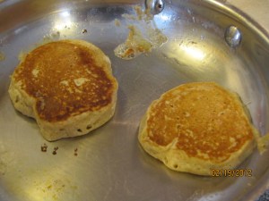3.  Drop a spoonful of batter into pan.  Once batter forms a few bubbles on top, flip.  Continue flipping until golden.