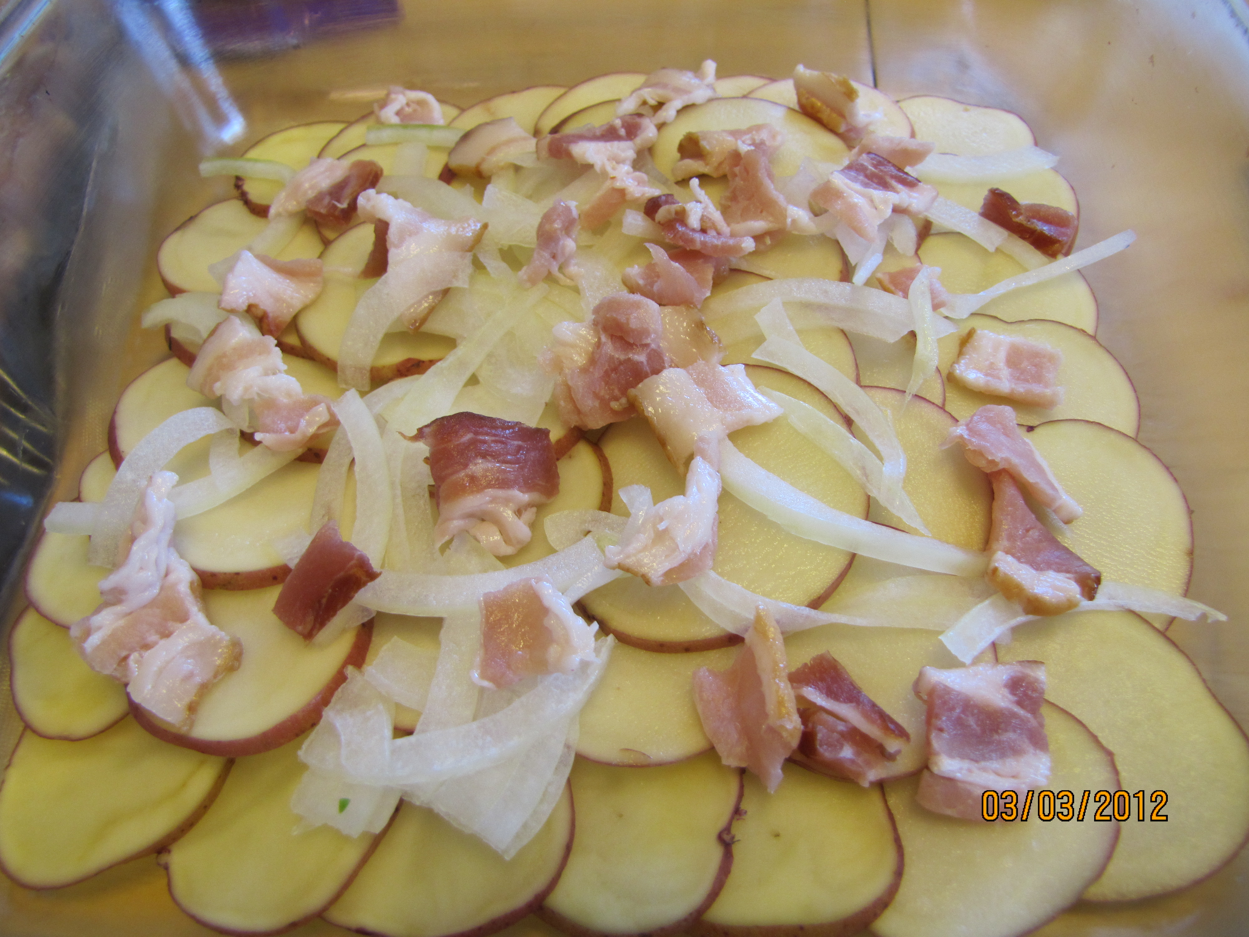 3. Line baker with ½ of the potato slices, onion and bacon.