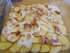 5. Repeat with another layer and bake in the oven until potato slices soften and bacon becomes firm. Around this time I usually work on laundry or do other chores around the house until this step is completed. Then I walk into my kitchen and am invited by a yummy aroma.