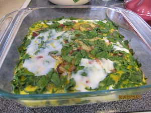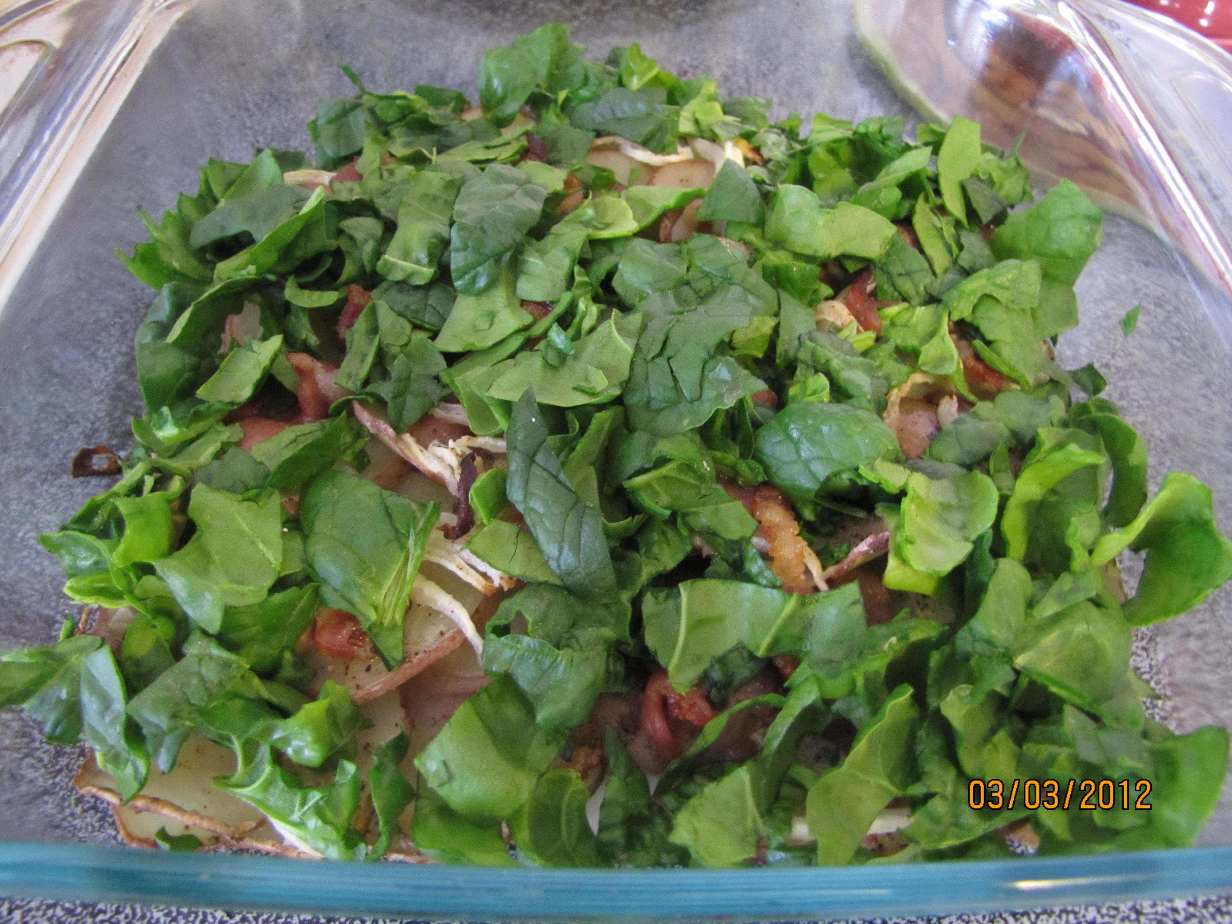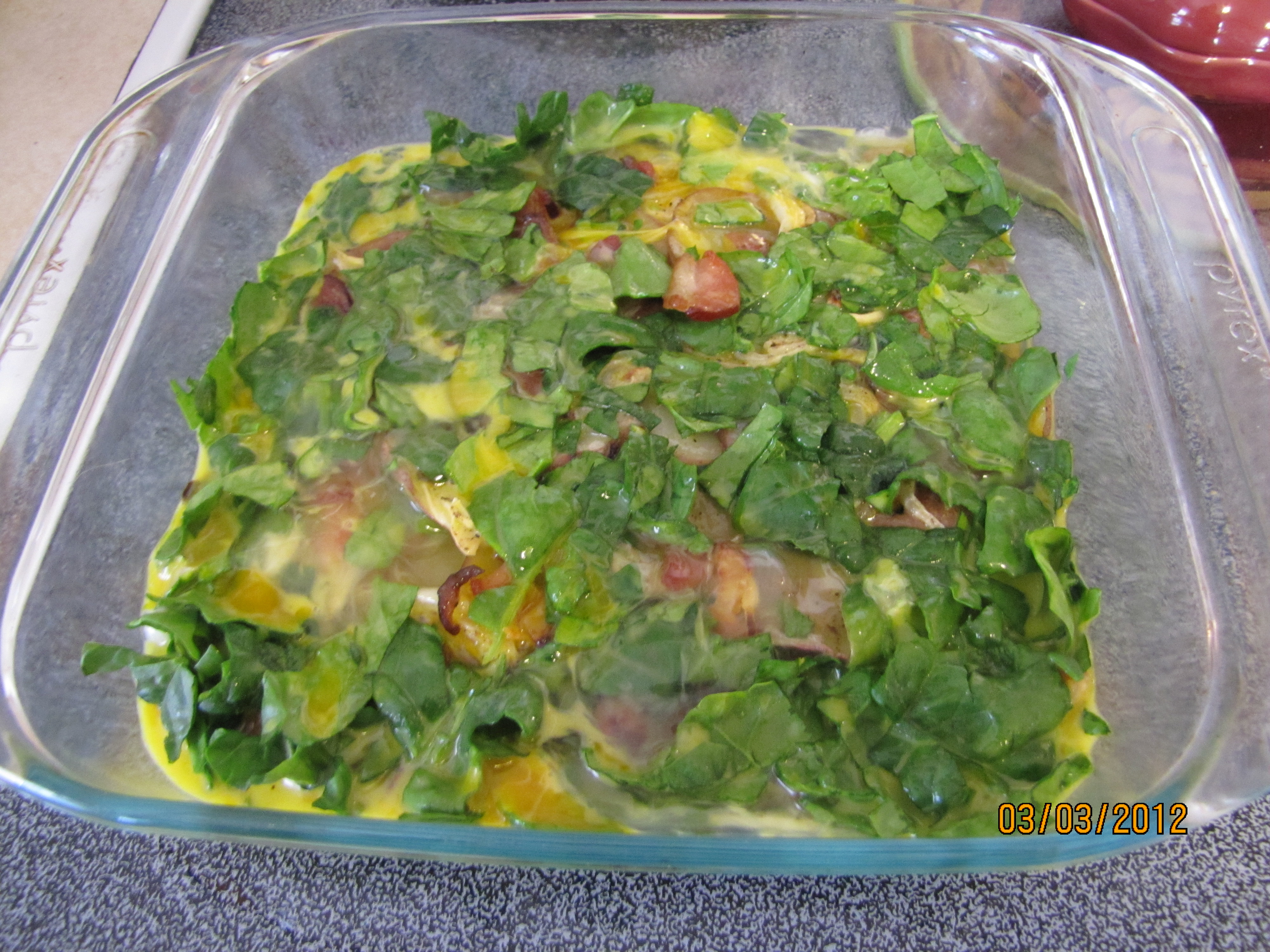7. Mix egg and milk together and pour on top of the spinach, potatoes, onion and bacon. (The egg will fill in the gaps in the potato bottom and help make a firmer base.)