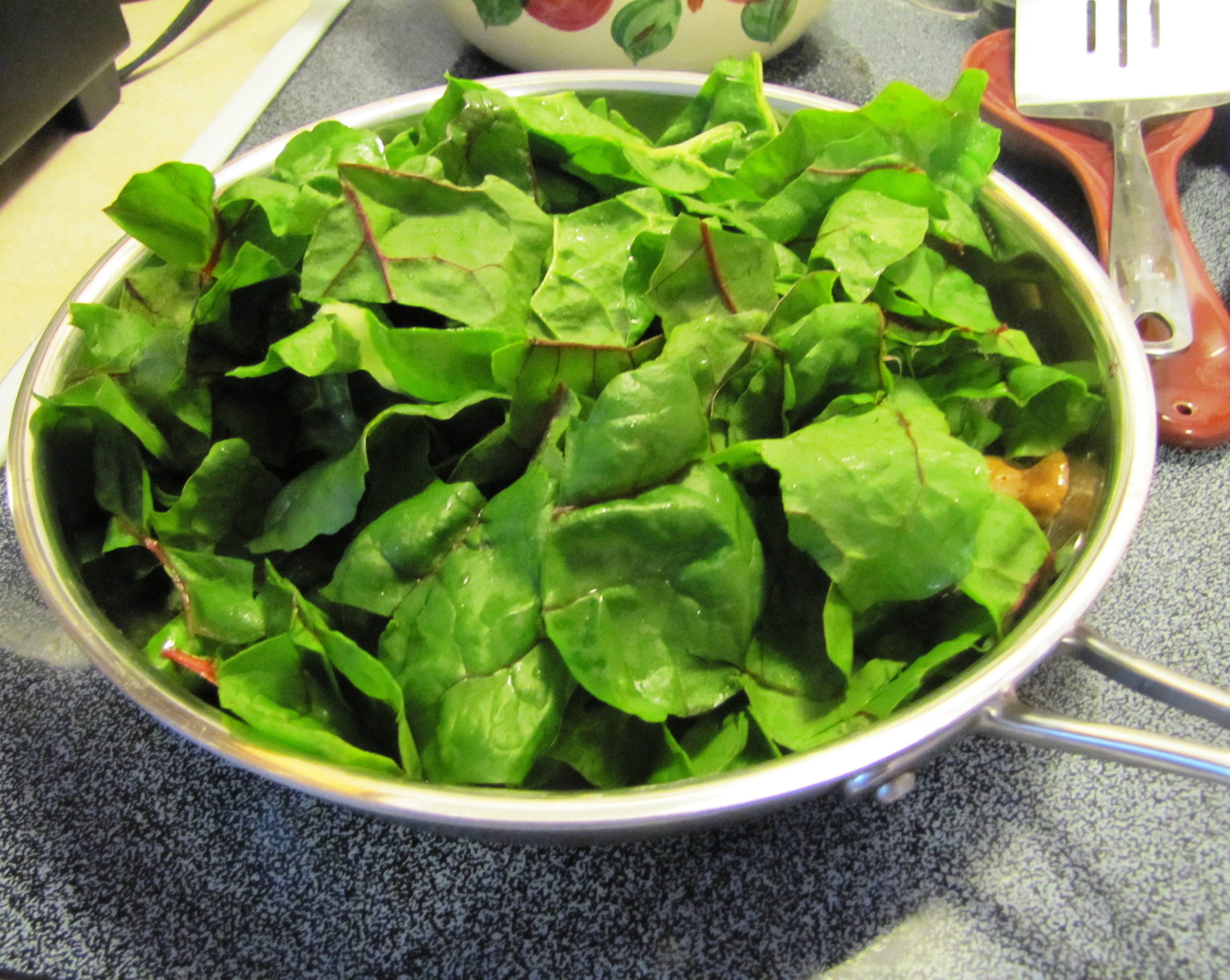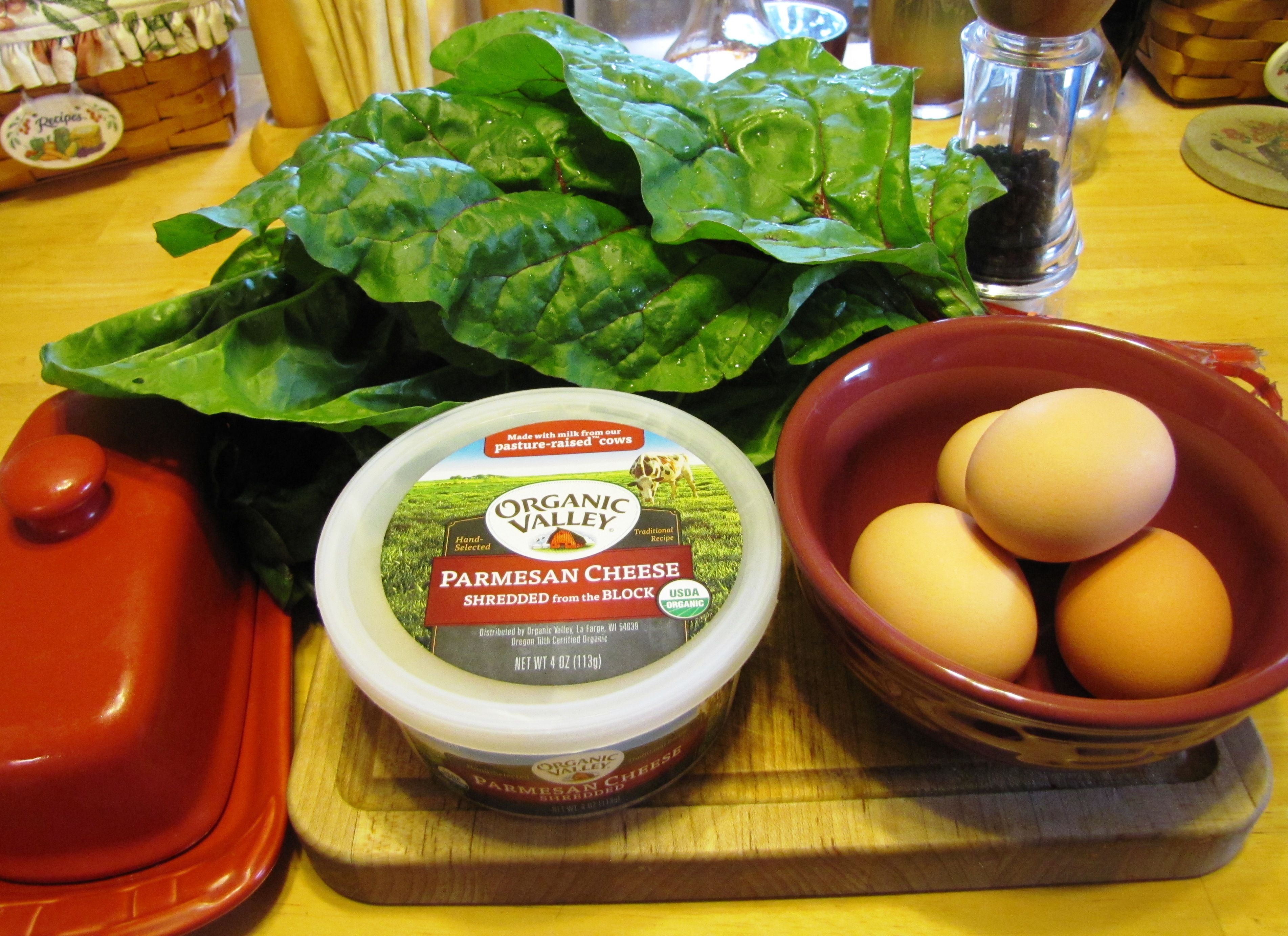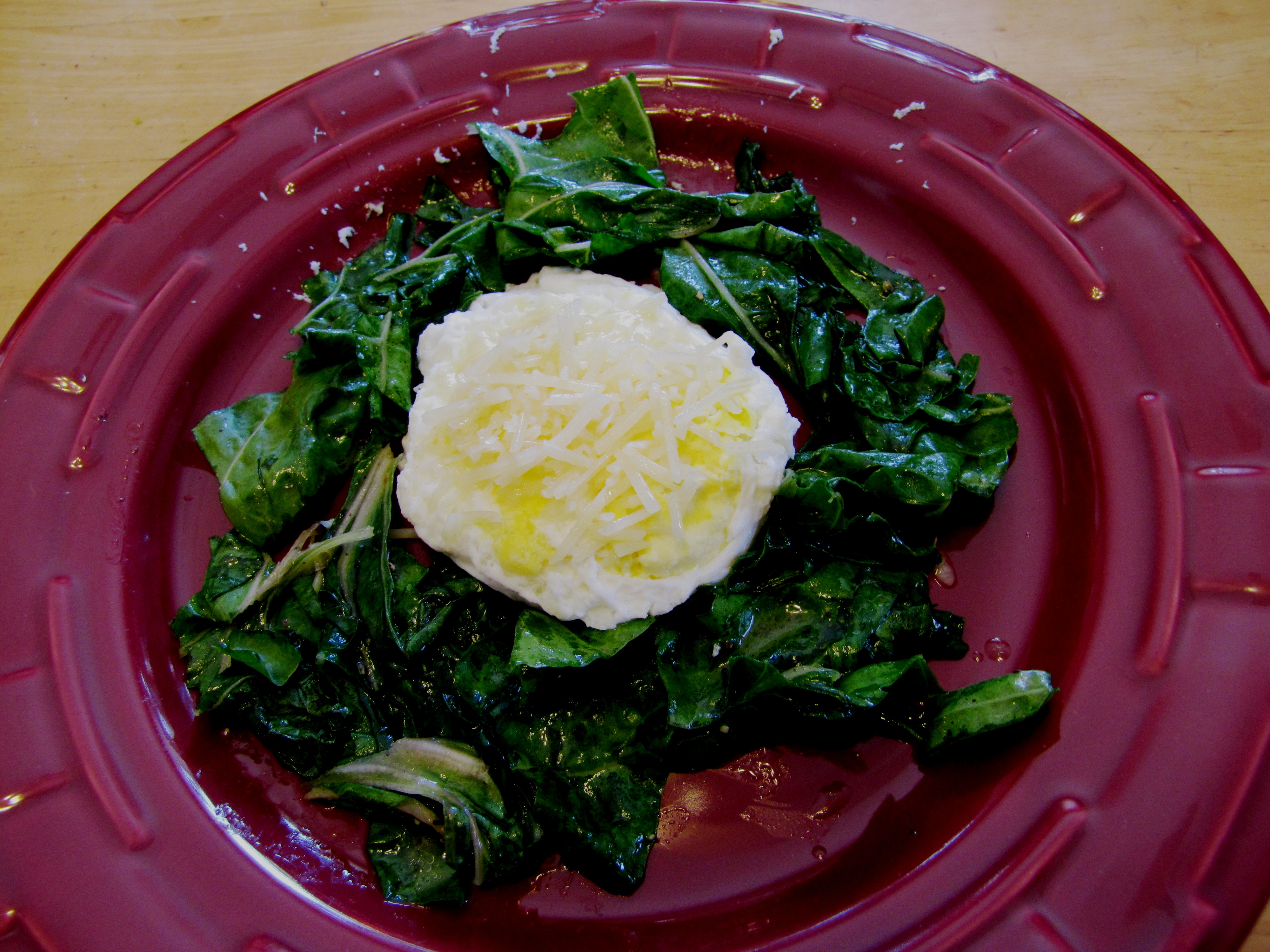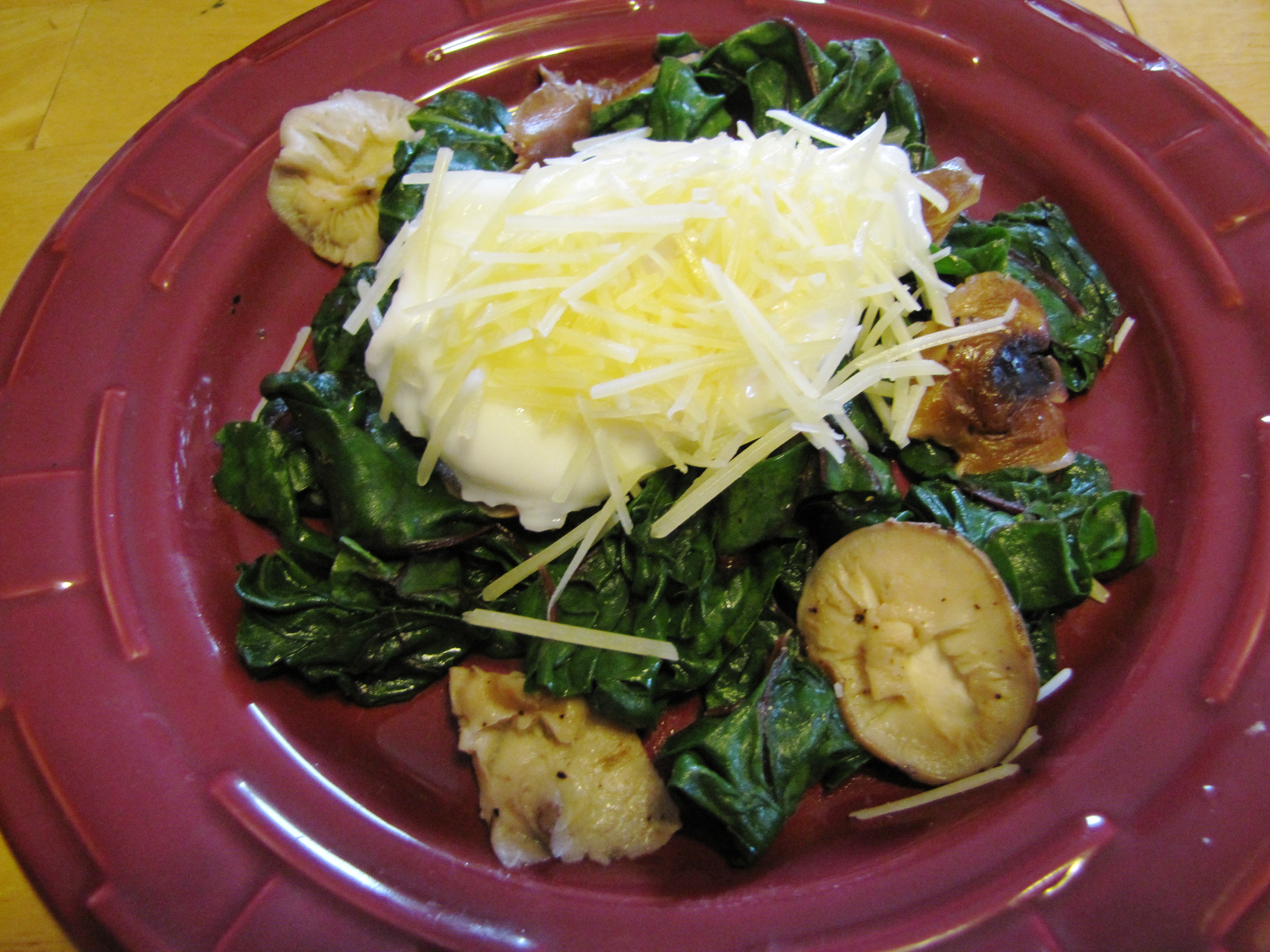 With some tongs, spread out sauteed chard with or without other ingredients over the bottom of your plate. Place poached egg on top and sprinkle egg with parmesan cheese while still hot.