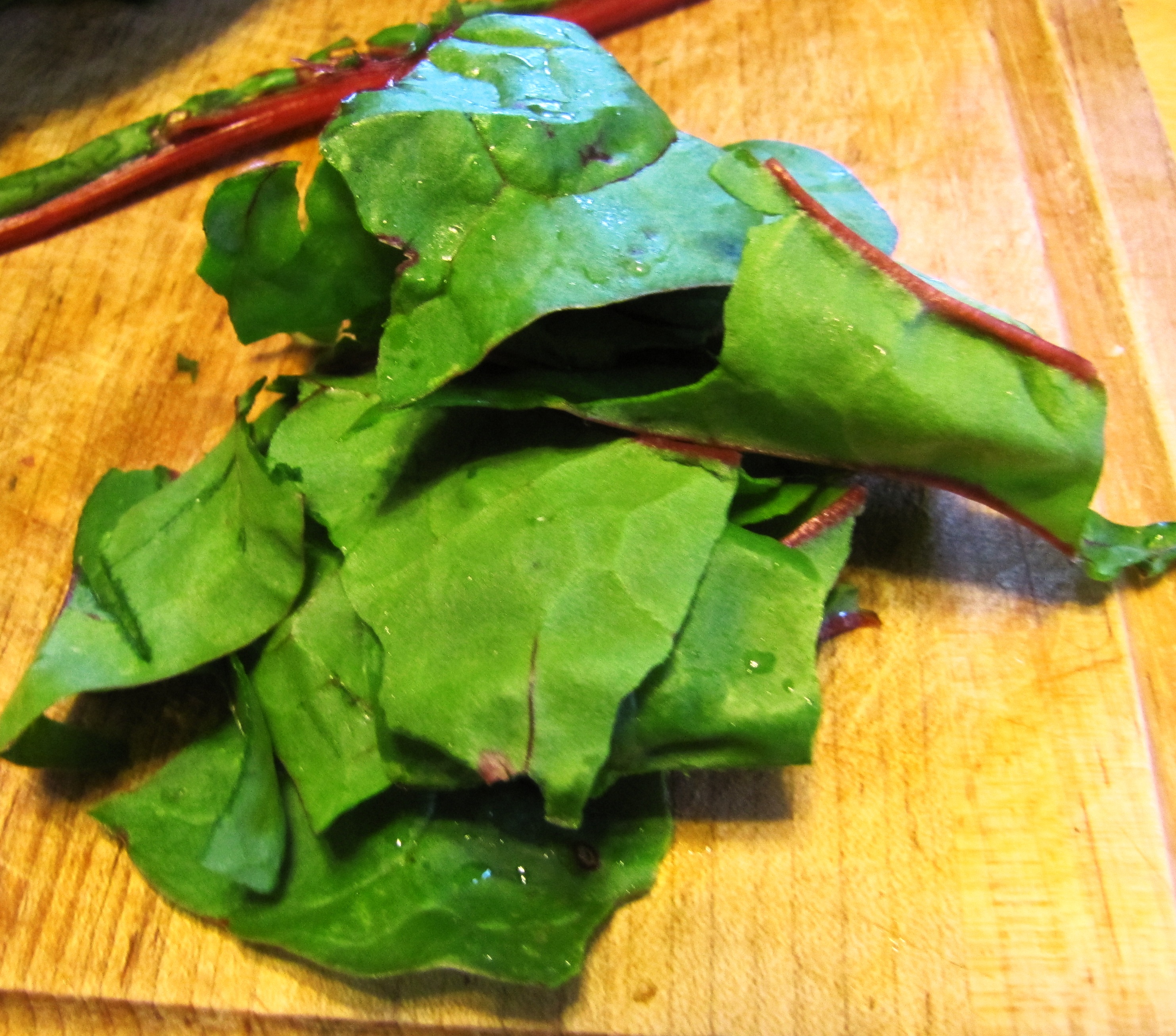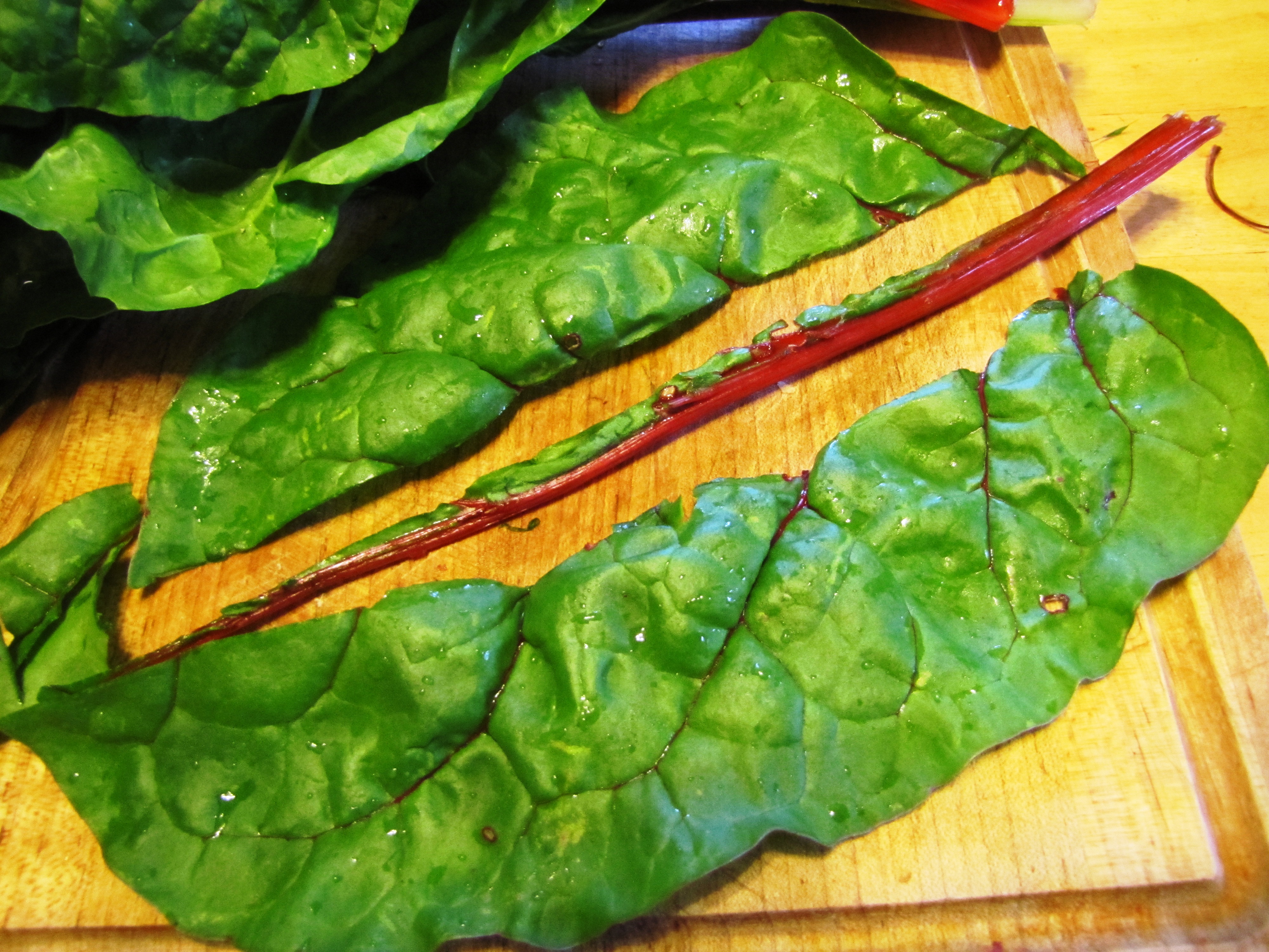 After washing chard leaves take a knife and cut down the length of each chard leaf on both sides to separate the greens from the stem.